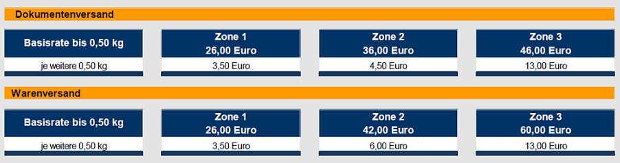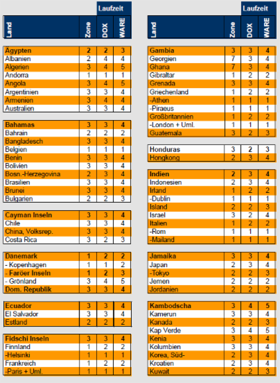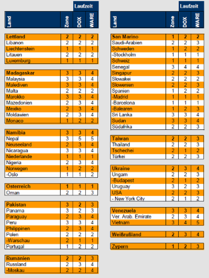 Die angegebenen Laufzeiten verstehen sich als Regellaufzeiten für Arbeitstage. Alle Preise zzgl. der gesetzlichen Mehrwertsteuer und Treibstoffzuschlag. Für diverse Destinationen sind Zollpapiere (Proformarechnungen), T1 oder AE´s) notwendig. Hier entstehen Zusatzkosten für die Verzollung. Alle nicht aufgeführten Länder und Inseln sind selbstverständlich auf Anfrage möglich. Es gelten unsere aktuellen AGB´s.
